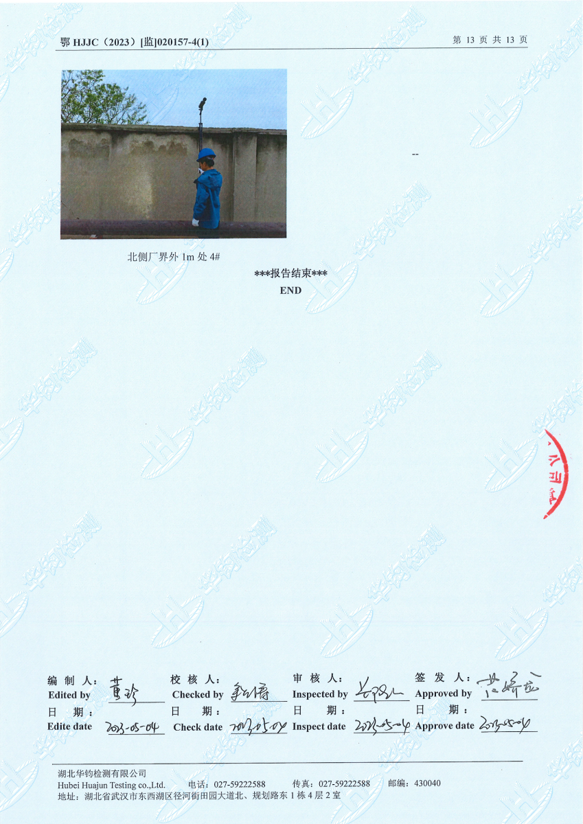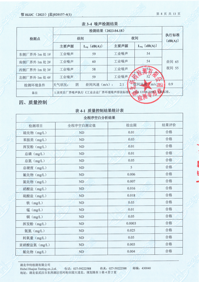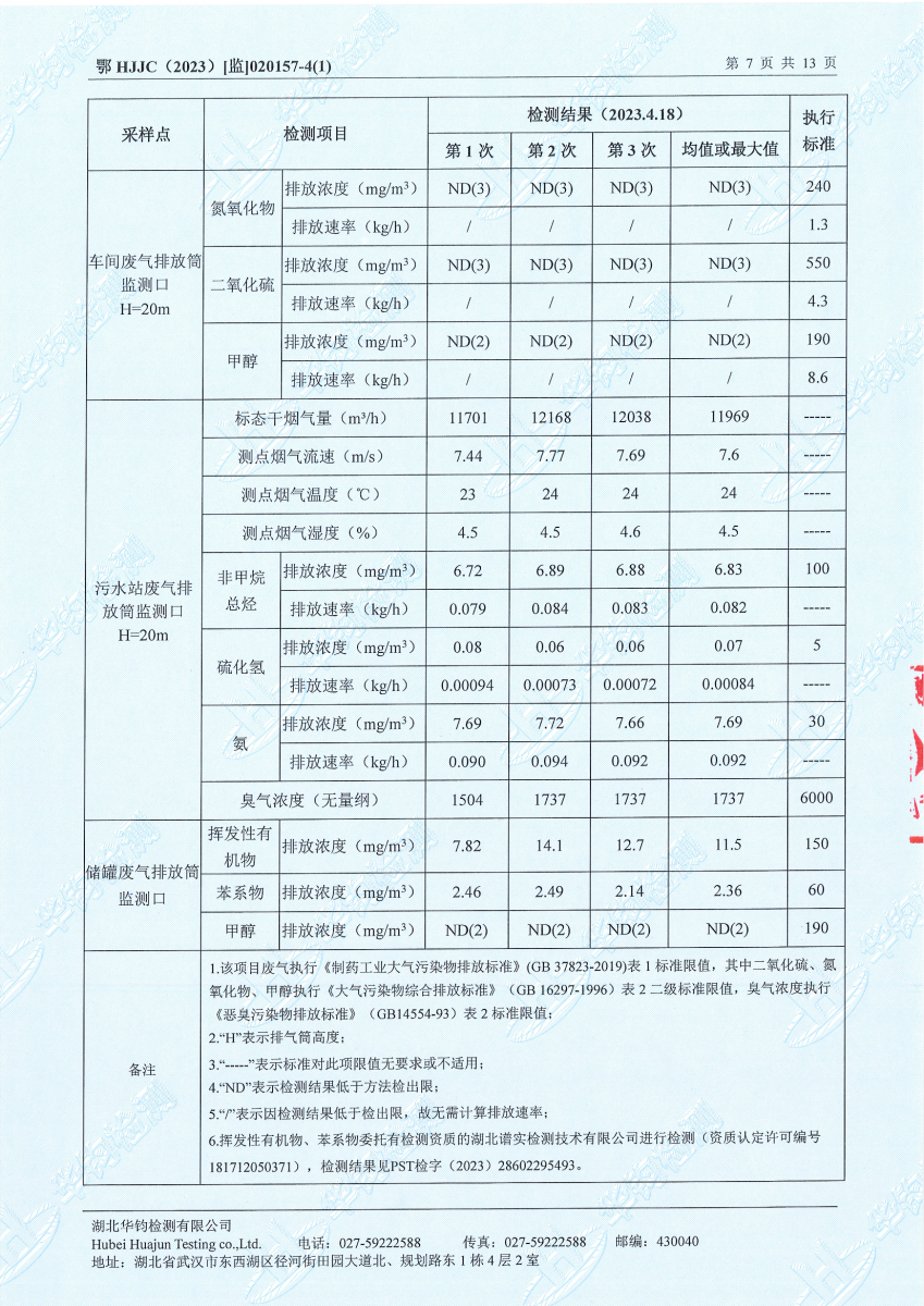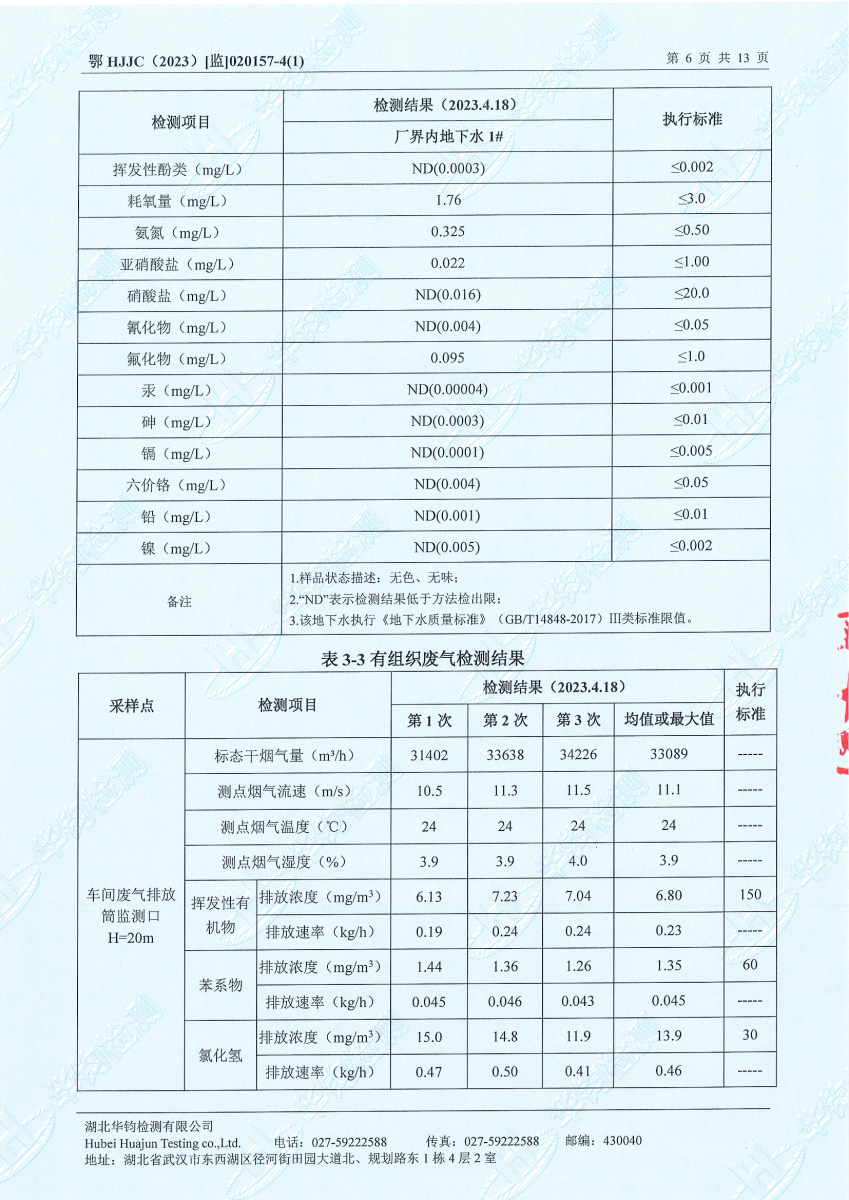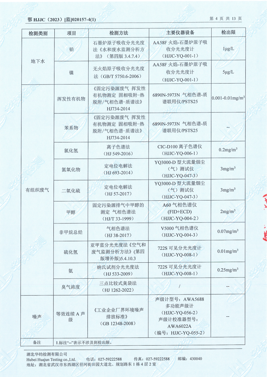 2023年第二季度,公司按照国家企业安全生产标准,对公司所排出的污染源,委托第三方进行抽样检测,详细的检测报告如下