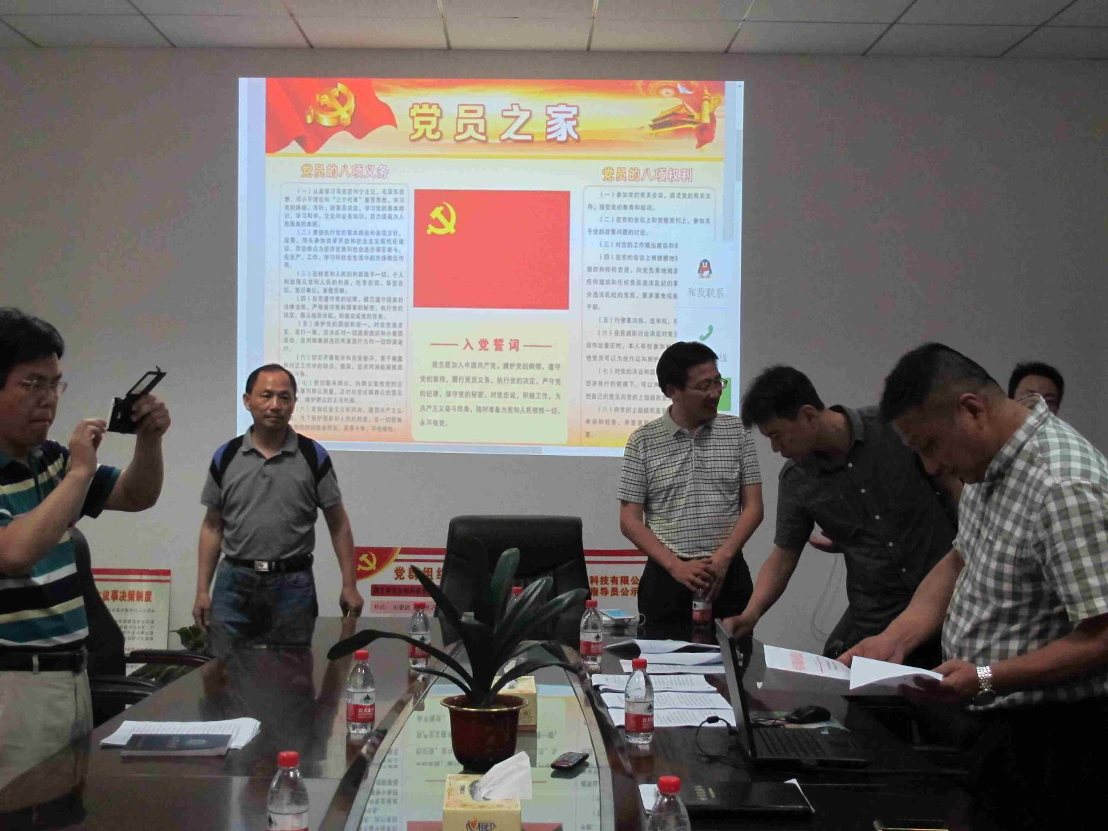 调研组一行先后查看了公司支部会议记录本,党员学习心得,支部会议签到表,以及《党员权利保障条例》,并在电脑上察看了公司支部党课学习内容,现场抽查了公司党员手机微信里是否开通《共产党员》,《黄冈党旗红》公众微信订阅号,当调研组主要负责人看到我公司党员手机均已开通《共产党员》、《黄冈党旗红》公众微信订阅号,感到十分满意。同时希望企业今后抓党建工作要不拘一格,突出特色,把企业日常工作和学习教育活动有机结合起来,以围绕生产抓党建,抓好党建促生产为目标,让党旗在非公企业高高飘扬,力促非公企业得到更好更快的发展。