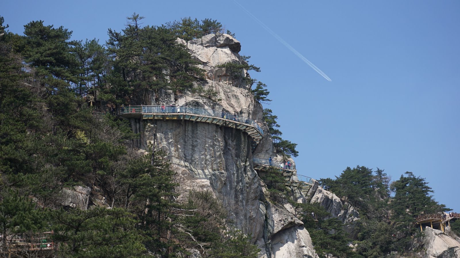 行至玻璃栈道,栈道宽1.8米,全长70米。此处地势险要,上下凌空,视野开阔,上看一线天瀑布、哲人峰,下俯天堂大峡谷、猴谷、吊桥河。位于海拔1080米小华山一线天悬空崖壁处。信手拈来云一片,天堂寨顶览奇观,行走栈道犹如凌空徒步。